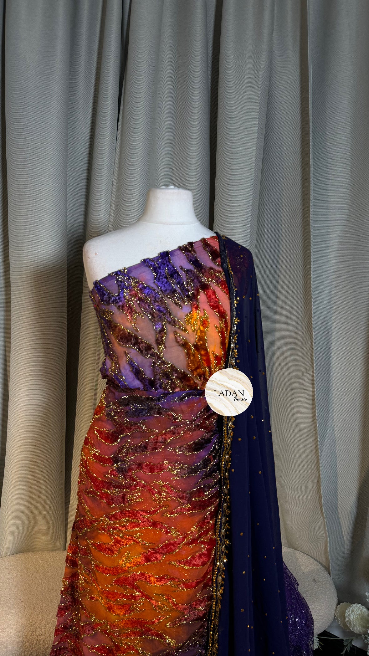 This dirac is medium-full bac and includes a 3.5m dirac fabric. The fabric is a blend of chiffon and velvet.
